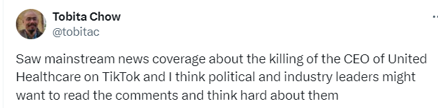 Overall, social media were flooded with comments comparing the assassination of the CEO to US healthcare and insurance denial of medical care.