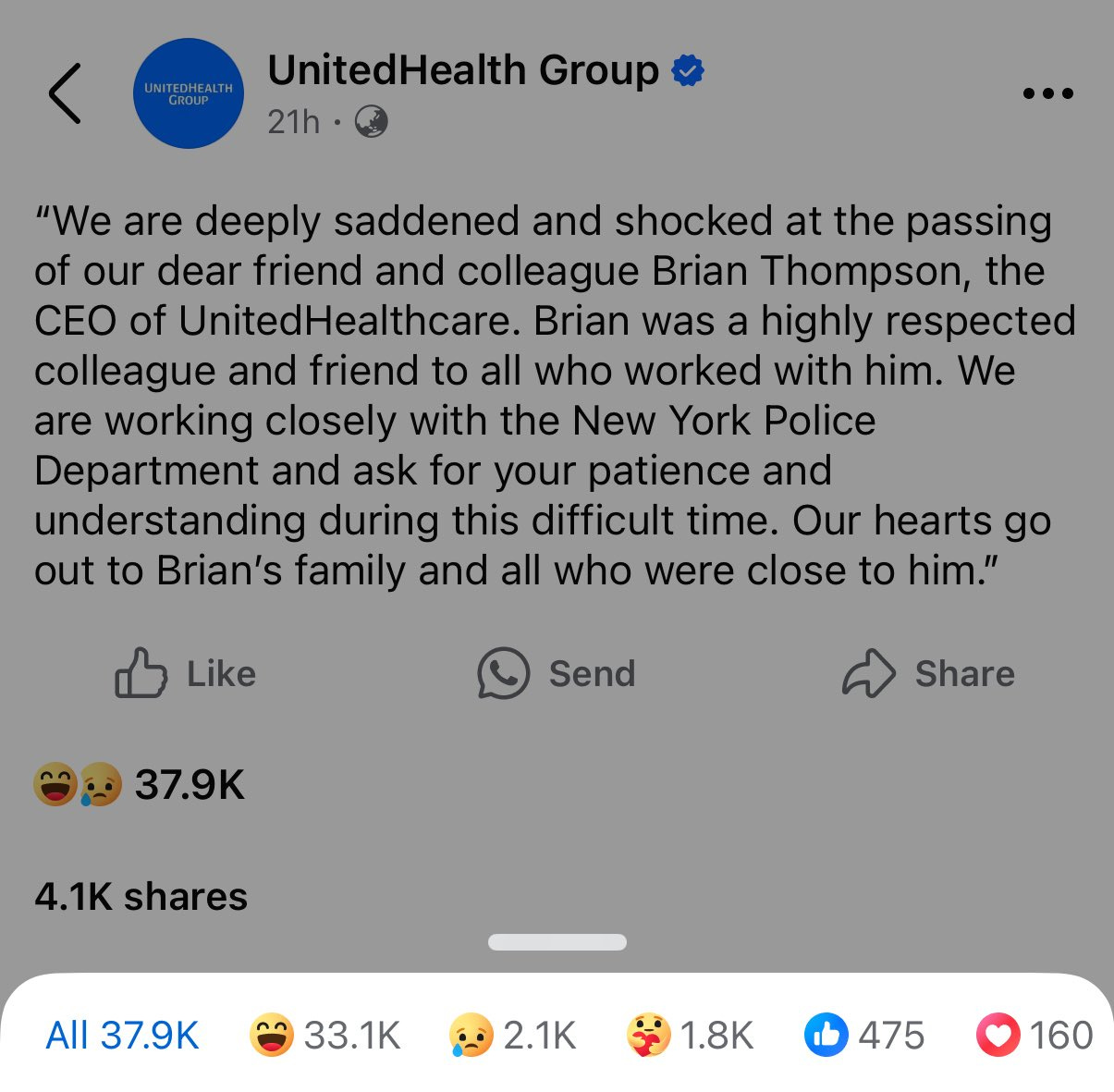 It was his leadership decision to use AI to deny medical claims and having the highest denial percentage rate of all insurers. He valued money over lives. That’s why no one cares about his