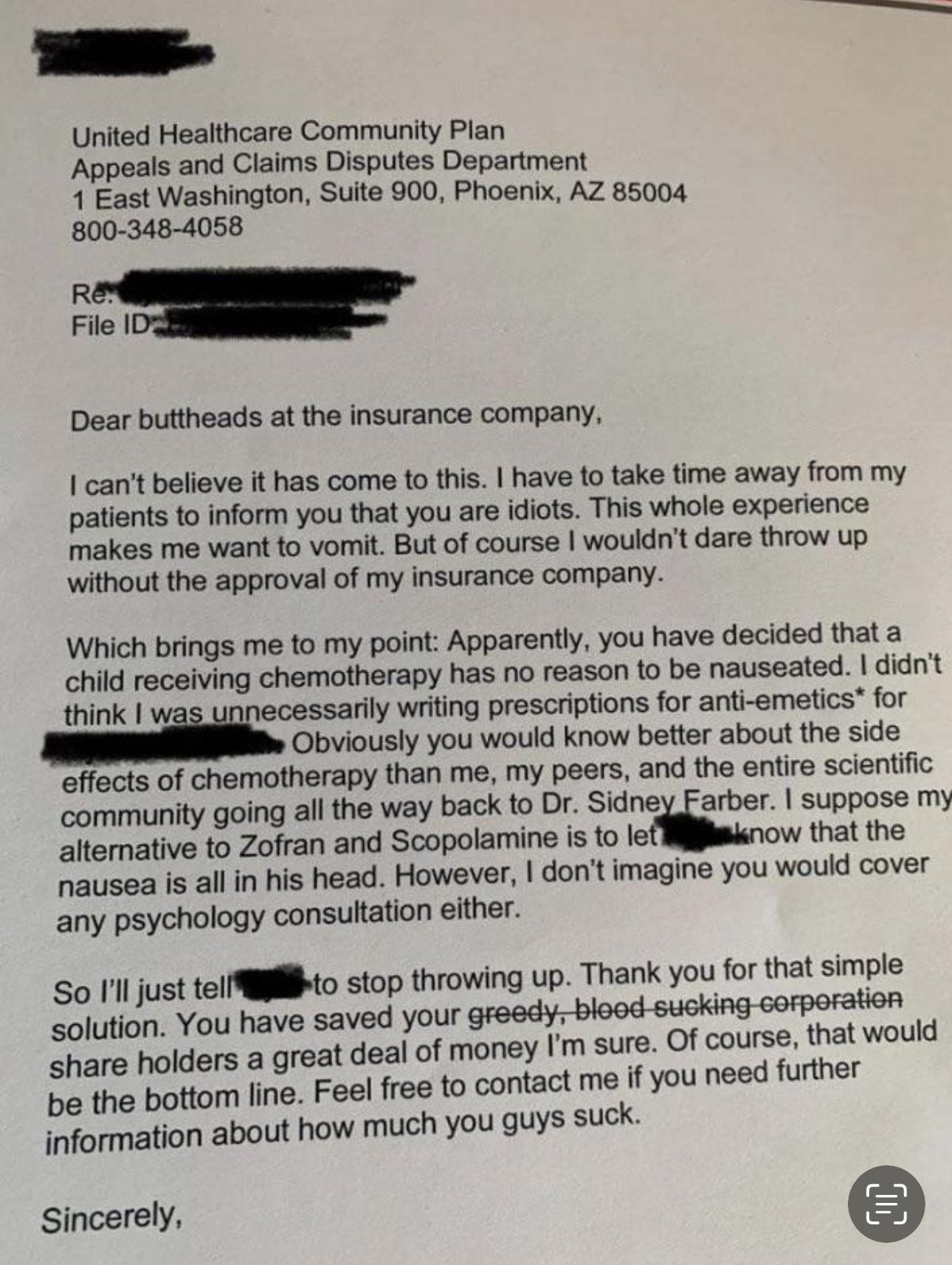 "Innocent" is doing a lot of heavy lifting there. Maybe they shouldn't have been denying so many claims? Sympathy has been declined because it is out of network.