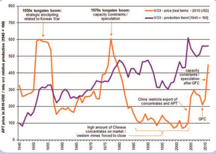 Historically, tungsten prices have boomed either from large scale industrial war (WW2, Korea) or supply shortage after many mines closed.