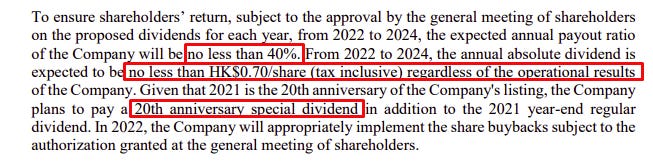 From 2022-2024, dividends should be at $HK0.70/share, plus a special dividend for the 20th anniversary of the company. Regardless of the stock price, some 7-10% dividend yield seems guaranteed for 2022 and more in later years with the company production growth (short a new collapse in oil prices of course).