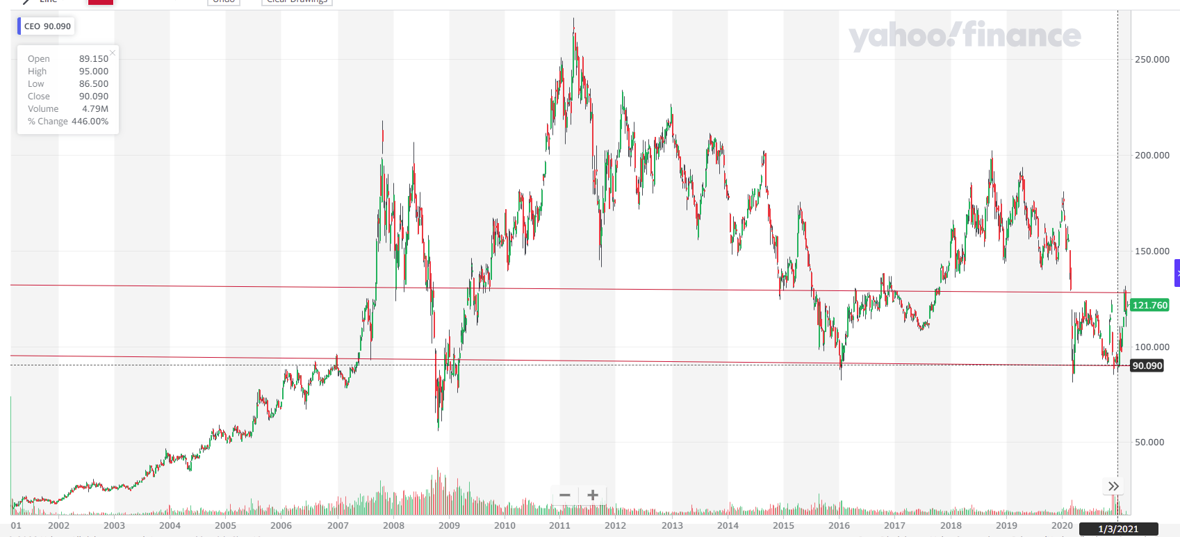 Do you remember the Exxon stock chart, showing that a lot of the price recovery had already occurred? Well, this is far from true for CNOOC. In the last oil bull market, CNOOC was at a share price of 250, roughly twice what it is today. It is still in the same price range as it was at the end of May 2020.