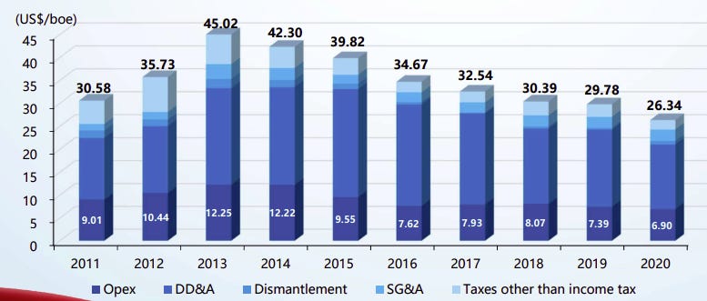 With oil companies, it is important to see if the geology and costs structure is good enough. First, reserves are at the somewhat low of 10 years long, but it is worth noting that CNOOC managed to maintain the reserves at this level for the last 4 years. They actually increased, with 6% in 2020 (more got found than pumped out).