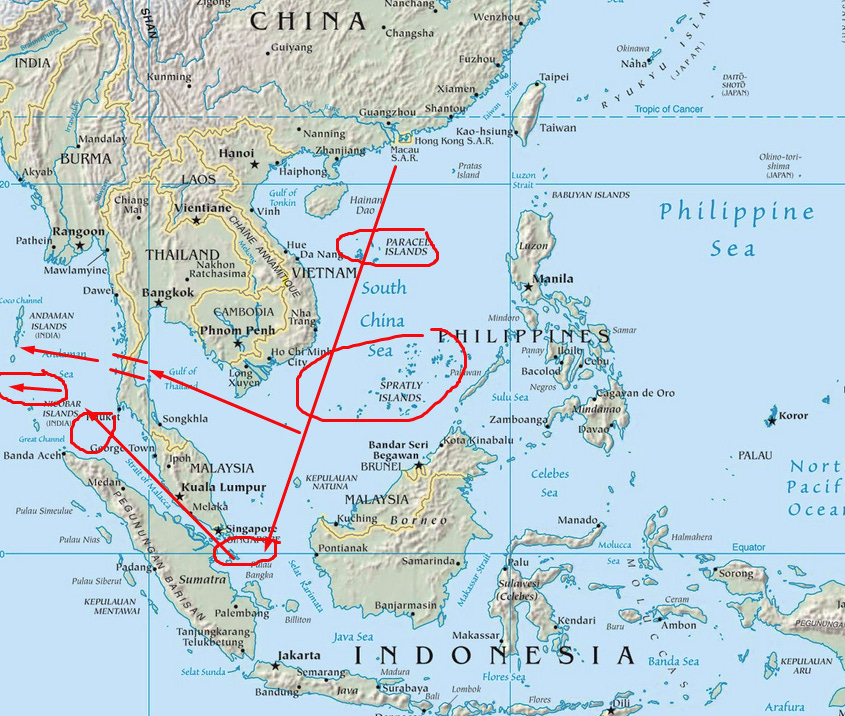 This is also why the "Belt and Road"-supported Panama-like canal is planned in Thailand, cutting possible Indonesian influence and offering another alternative passage (I marked it on the map too).