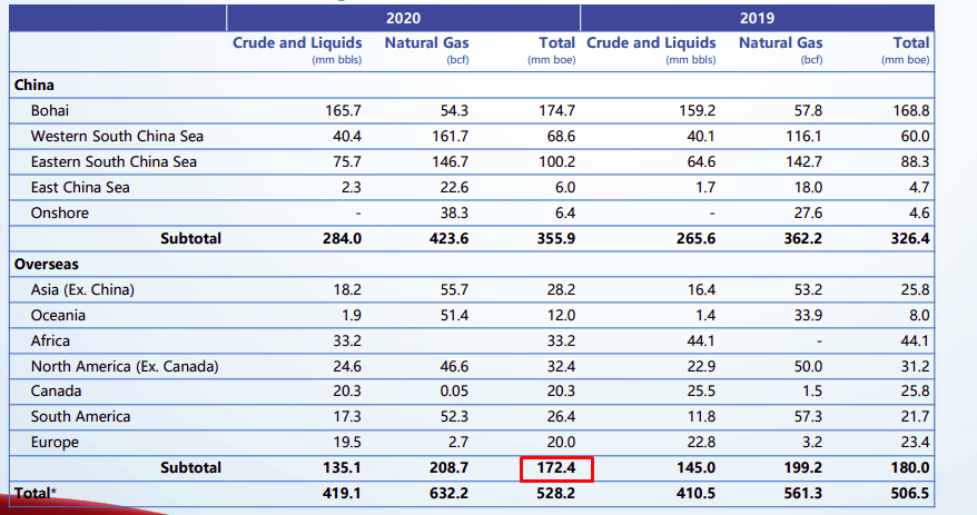 CNOOC is producing 1.4 mboe (million barrel or equivalents) per day (this include both gas and oil), or 526 mboe / year. This put its reserves at 10y, not bad, but not really stellar either.