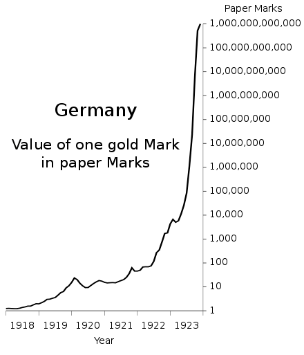 In 1923, the Ruhr Crisis finally pushes the Deutsche Mark over the edge and hyperinflation starts.