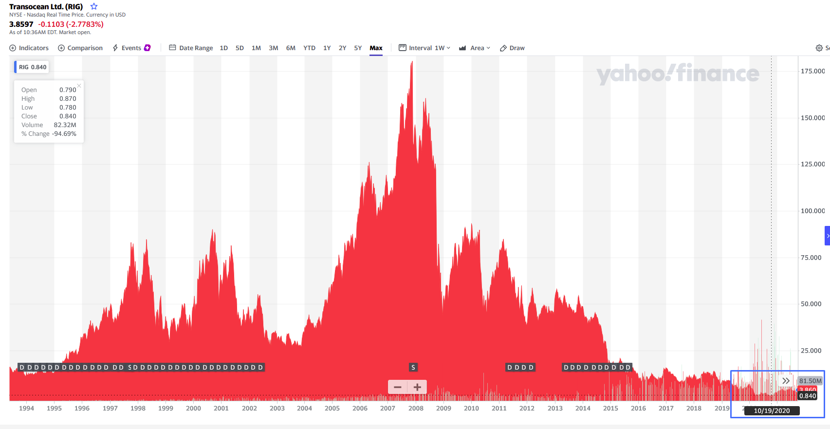 Is it too late to buy RIG? Did I just miss the boat? It could seem so looking at the graph above. But let's take a little bit more perspective, shall we? How do the 20+ years performance look like? The last 12 months rally I just showed you are barely a blimp compares to the historical data.
