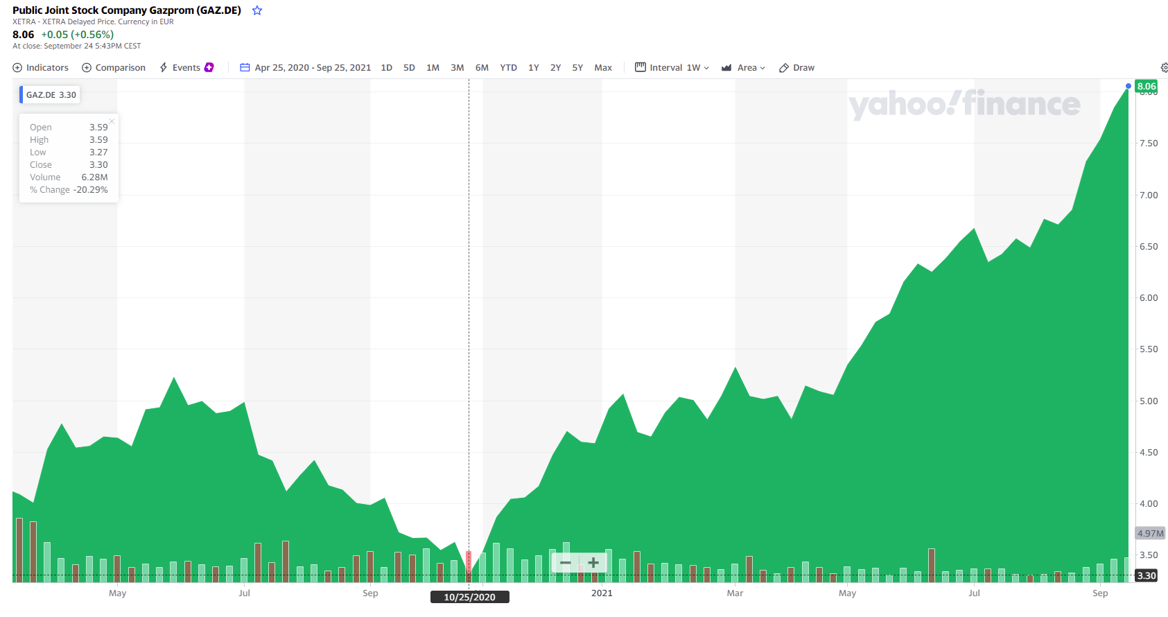 I am aware that this will sadly mean a lot of real hardships for a lot of people, and especially the poorest and the most vulnerable. This is actually pretty tragic considering that it could have been avoided with better policies and planning. But I am still struggling to not gloat a little when looking at the Gazprom chart, from its 3.3 EUR at the end of 2020 to its current 8.06. (and no I did not catch the bottom due to overthinking it and waiting too long to press the trigger, but I am still up 40% for the year on this position, which is good enough).