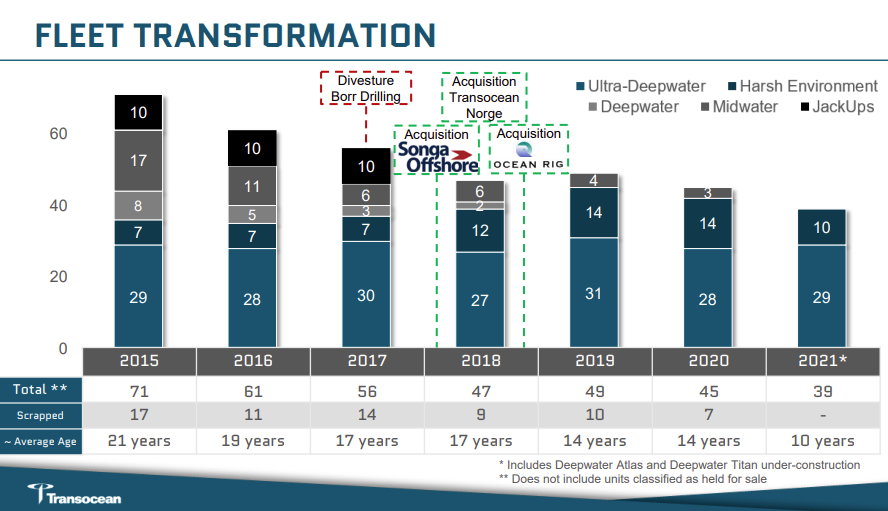 As I mentioned before, most of the easy-to-find and exploit oil & gas deposits have already been found. The one that have not yet been discovered are located in difficult-to-reach environments. Either very harsh weather conditions, especially the Arctic, or very deep under the sea. While its competitors were focused on operating legacy equipment for shallow waters, Transocean has progressively divested its drilling rigs for shallow and mid-depth water from 2016.