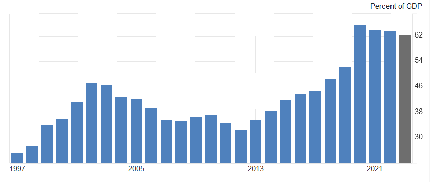Debt to GDP has increased a lot since 2012, partially driven by a slump in commodity prices.