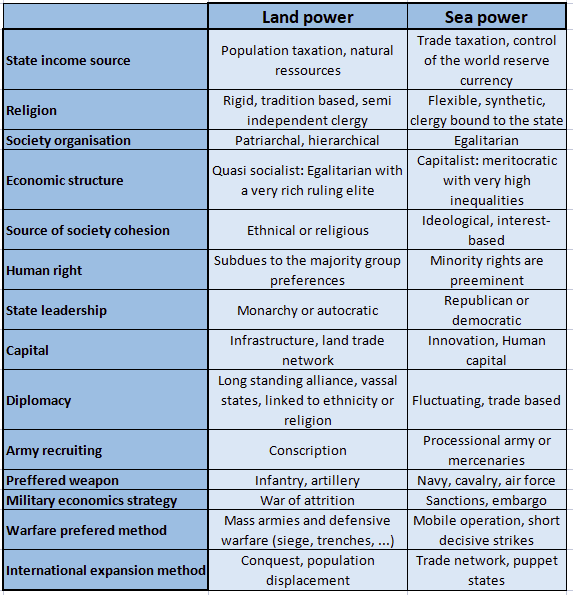 By their very nature, the land powers tend to be more conservative, religious, and traditionalist. People do not move often from their land, nor does society evolve much. It will be highly motivated to defend its values, and often expansionist.
