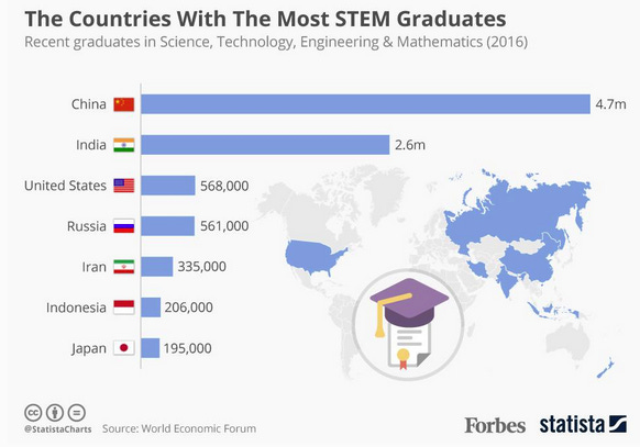 Even if the real number is lower, China seems to train more people in STEM than the rest of the world combined. Short of Indian engineers, the West would be ridiculously outmatched in the training of people able to work in STEM.