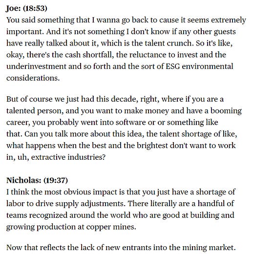 This is a part of a transcript discussing how we are going to face a massive copper shortage in the incoming years. Some of the reasons are easy to guess. Increasingly complex regulations or low industry capital expenditure for example.