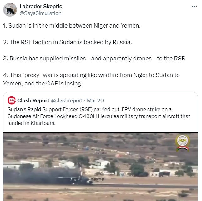 Troubles in Niger, Sudan, and Yemen, the expulsion of French troops from Mali and Chad + the entry into the BRICS of Egypt + Ethiopia makes for a massive chunk of the world falling out of Western control.