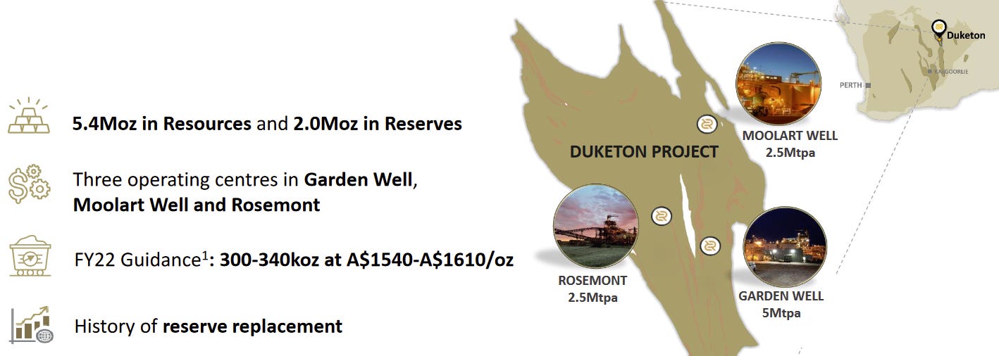 Duketon mines are long-lasting assets with large reserves: 300-350k ounces produced per year, 7.4 million in the ground. So lasting roughly 20 years at least.