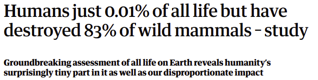 https://www.theguardian.com/environment/2018/may/21/human-race-just-001-of-all-life-but-has-destroyed-over-80-of-wild-mammals-study