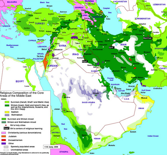 On top of these cultural and ethnic divisions comes the question of religion. The Shiia are the largest minority in Islam, which is predominantly Sunni. Out of the Middle East Muslims are almost all Sunni, including population juggernauts like Indonesia.