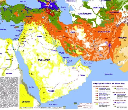 We can see where the Iranian influence has been the most durable by looking at where Iranic languages are spoken (below in orange). The other 2 large linguistic/cultural blocs are Turkish and Arabic. But even within these groups, plenty of division abounds, making the region famously fractious, unstable, and unruly.