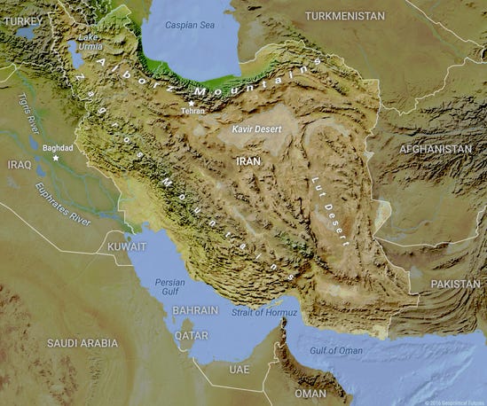 The core of Iran is a secure place shielded by mountains and deserts from which to build a power base. It then tends to expand outward. In general, Iran tends to control at least some of central Asia and Iraq.