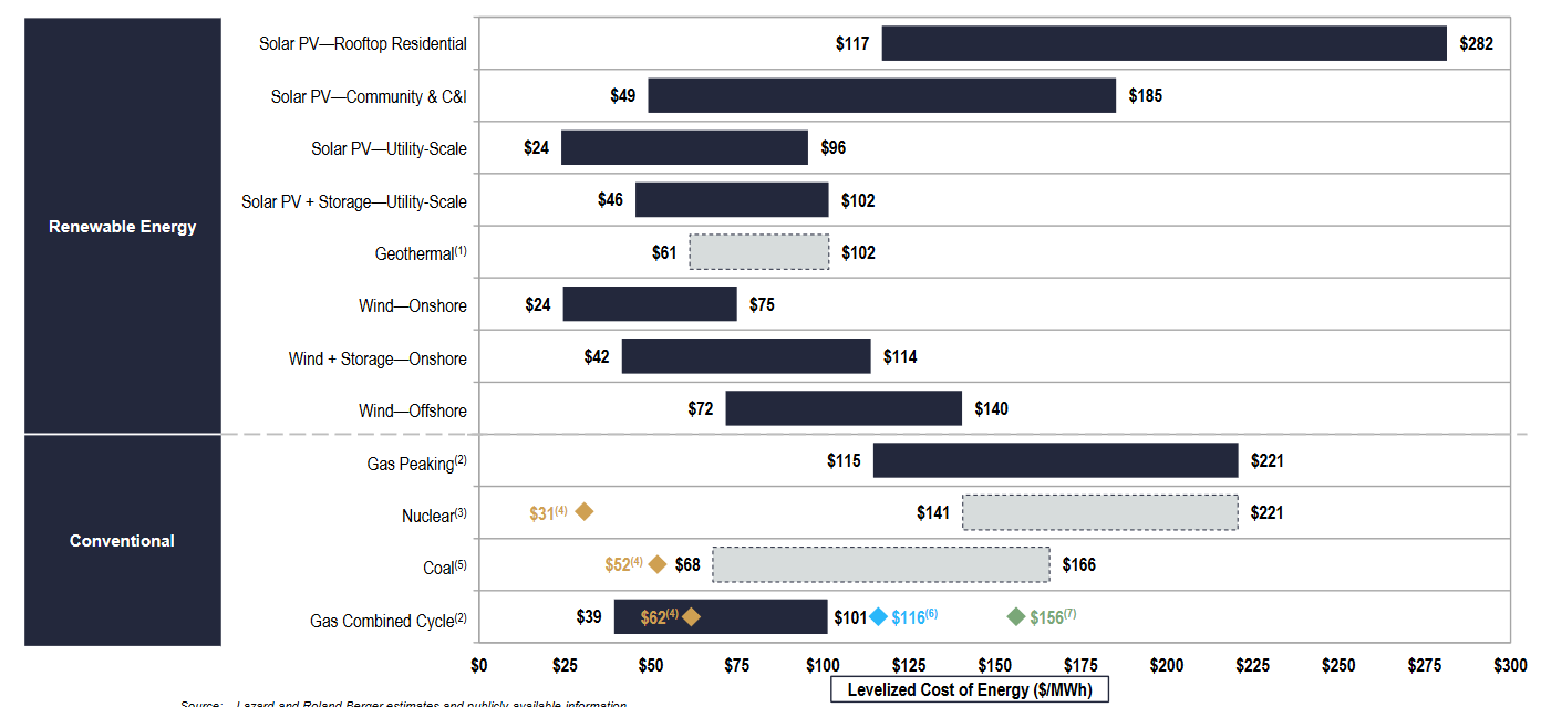 If you want to look deeper into various energy costs, I highly recommend Lazard reports. It is very rich in easy-to-read graphics like the one below: