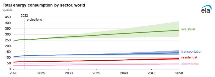 Most of the energy demand is from goods and industry, not transportation: fertilizer, steel, chemicals, shipping, mining, etc.