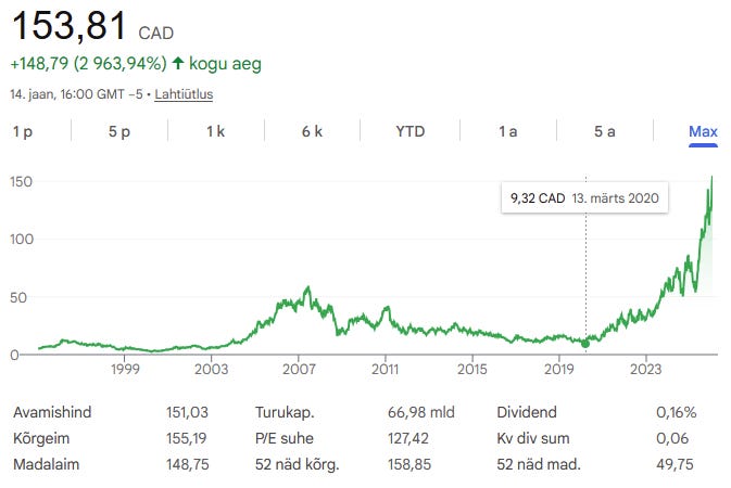 The obvious company here is Cameco, not any junior, as the uranium need is NOW, not in 5 years when maybe a mine opens. However, a stock chart that looks like that and a P/E of 127 makes me think this has already mostly run its course.