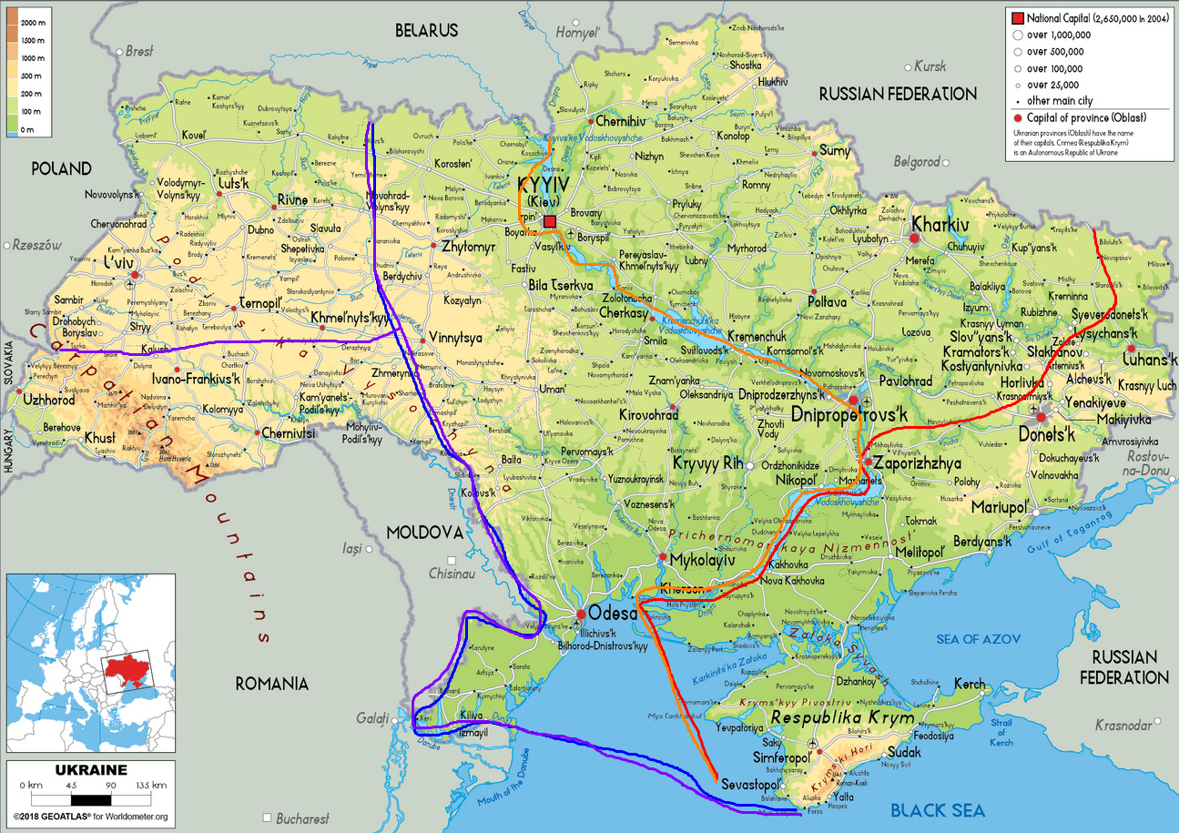 Orange line: Conquer the Eastern half of Ukraine + Kyiv, using the Dniepr River as a natural border.