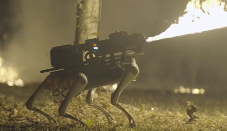 The capacity to innovate is alive and well in the West. For example, the flamethrower robodog above is from an American company.