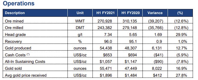 And of course, the average price of gold sold was better due to the much higher price of gold lately, as it was "only" US$1484 in H1 FY2020.