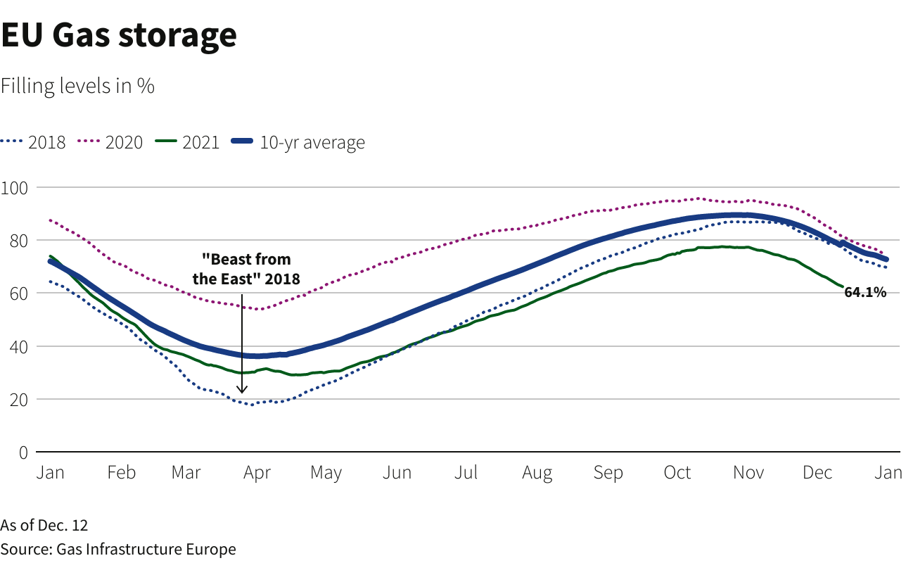 The theory of the "green transition" is that fossil fuels are becoming irrelevant, replaced by solar and wind. But after a 2021 summer that was windless and sunless, we have tapped into too much of our gas inventory to handle the winter.